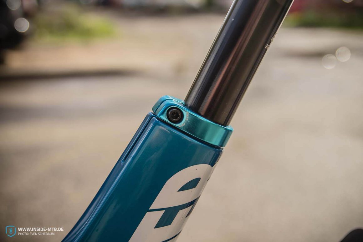 Die Innenverlegten Züge wandern durch den Bumper in den Rahmen. So hat man ein syymetrisches Erscheinungsbild und gleichzeitig die Funktion gewahrt getreu dem Motto: Form follows Function! Canyon hat es geschafft in den letzten Jahren einen großen Schritt hin zur eigenen Formsprache gemacht. Das i-Tüpfelchen setzt die integrierte Sattelklemme am Sender.