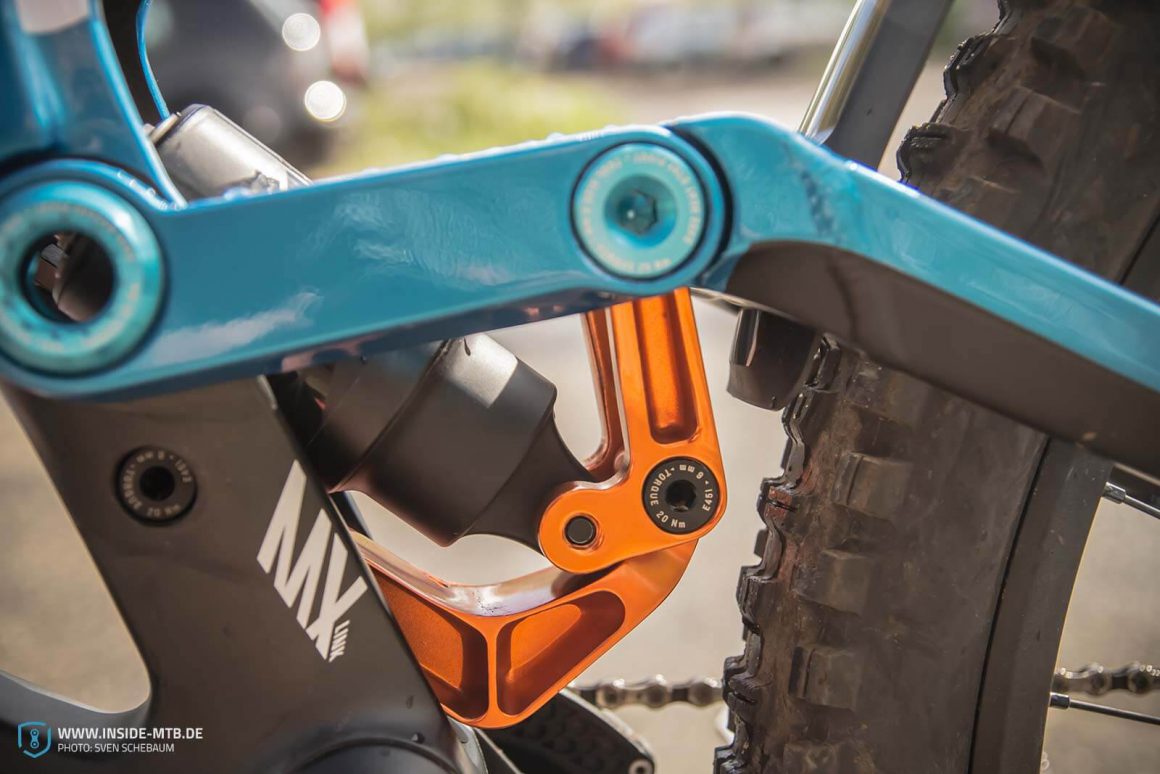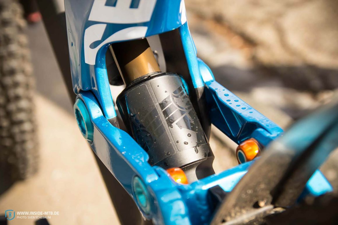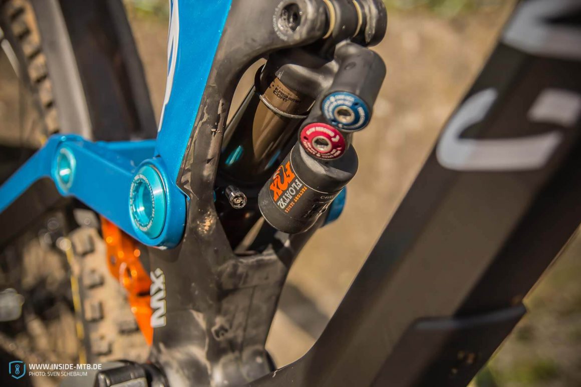 In der Topaustattung hat sich Canyon für ein FOX Fahrwerk entschieden. Canyon geht hier allerdings einen anderen Weg als andere Hersteller. Dank des MX-Links und der neuartigen Kinematik ist der Rahmen ausgelegt für Luftdämpfer im Heck. Daniel Oster, Produktmanager von Canyon der das Sender betreut sagte uns im Gespräch, dass man sich gezielt auf Luftdämpfer im Rahmen festgelegt hat. Durch die Progressivität, die ein Luftdämpfer von Hause aus mitbringt wird der Dämpfer vor einem Durchschlag bewahrt. Zum anderen profitiert der Fahrer durch das höhere Losbrechmonent welches der neue Canyon Sender Hinterbau mit sich bringt.