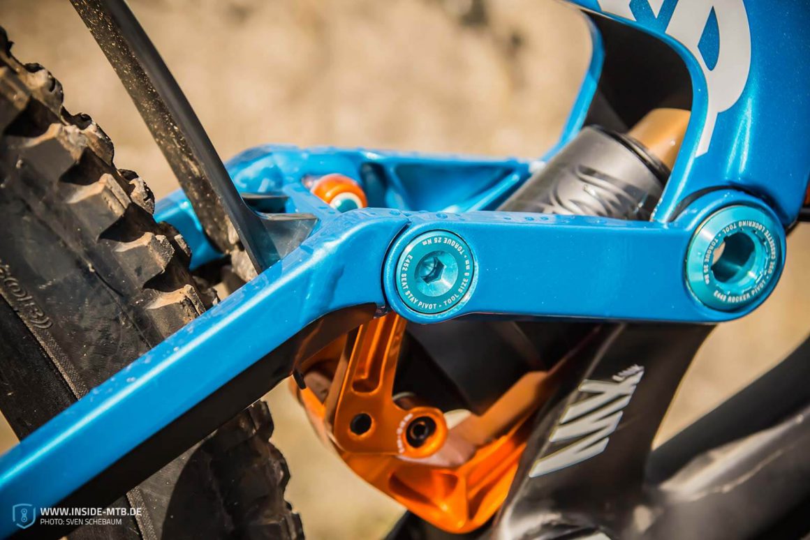 Der Hauptrahmen und der Hinterbau bilden mit durchlaufenden Lichtkanten und geometrischen Flächen vom Steuerrohr bis zum Dropout eine visuell zusammenhängende Einheit. Nur präzise Fugen an den Drehpunkten durchbrechen die Linien. Nur der neu entwickelte MX-Link tritt als Detail in Erscheinung und wurde unterhalb der Dropline als Herzstück des Bikes integriert.