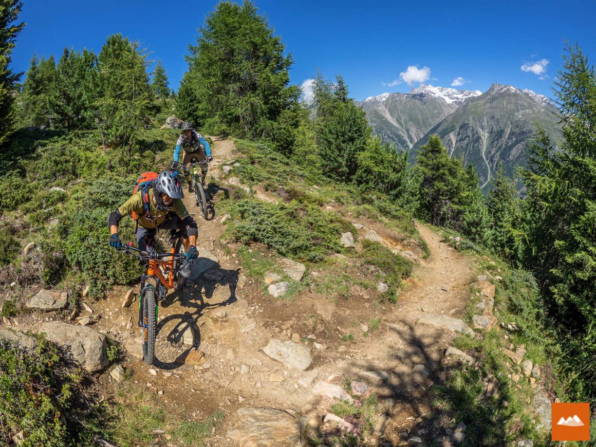 Sehr viel Spaß hat uns dazu die Eebme Line gemacht. „Ebbm“ ist der Ötztaler Begriff für „eben“ – also fast flach. Aber keine Angst, so flach geht es dann doch nicht dahin. Auf rund zwei Kilometer Länge überwindet man einen Höhenunterschied von 150 Metern. Dieser neue Flowtrail beginnt fast direkt bei der Mittelstation der Gaislachkogl-Bahn und ist sozusagen der Start hinein in das Herz der Bike Republic Sölden.