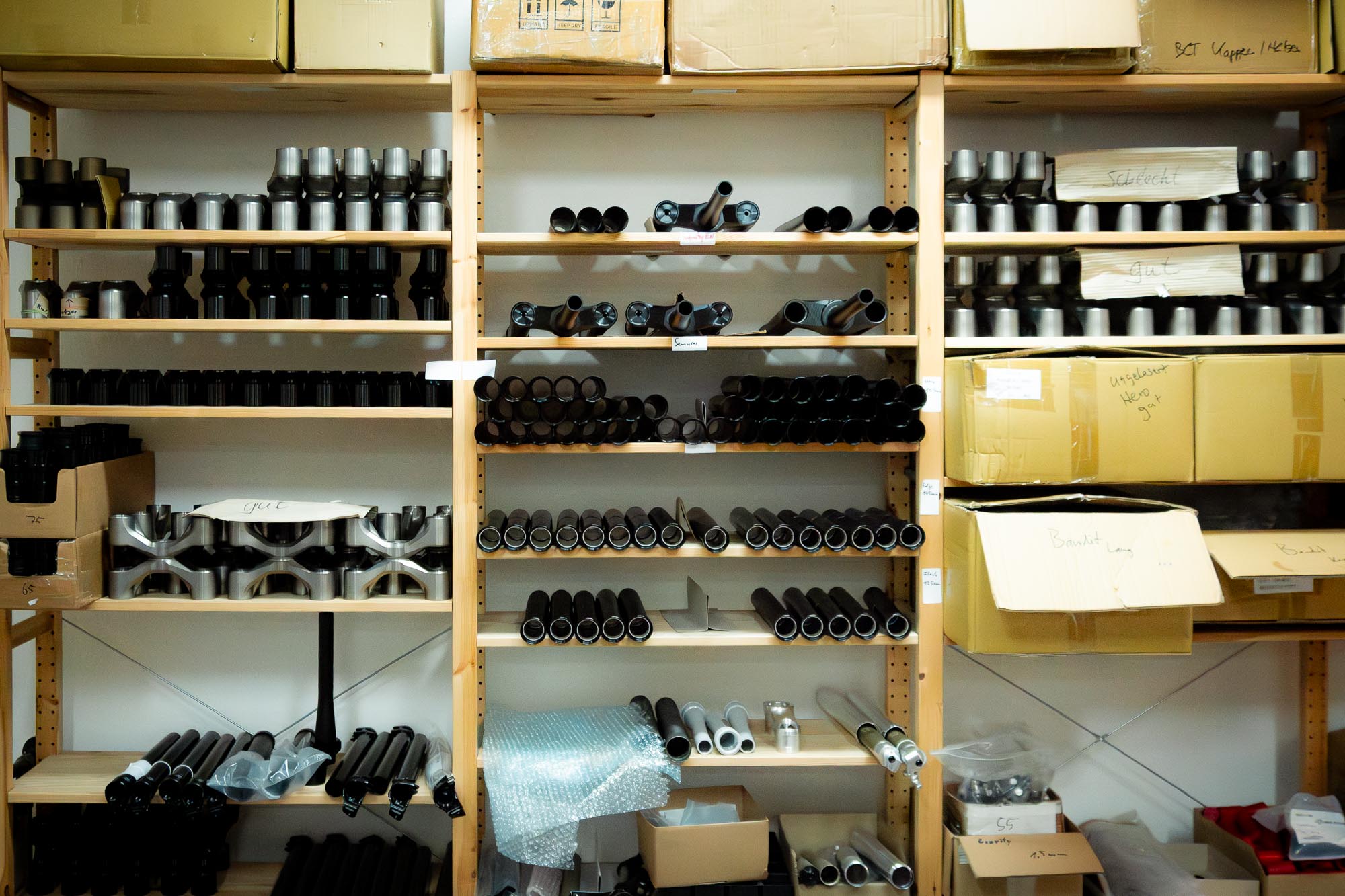 Cornelius führt mich weiter in den Raum hinein und eine gefühlte Sekunde später Erblicke ich das wohl gerade begehrteste Objekt der Hardcore Bike Bubble: Die Trinity. Säuberlich aufgereiht stehen Hebel und Körper zur Montage und fast beiläufig Erwähnt Mastermind Cornelius dass demnächst noch ein neuer Drop anstehen könnte. In mir kochen plötzlich 1000 Fragen hoch.