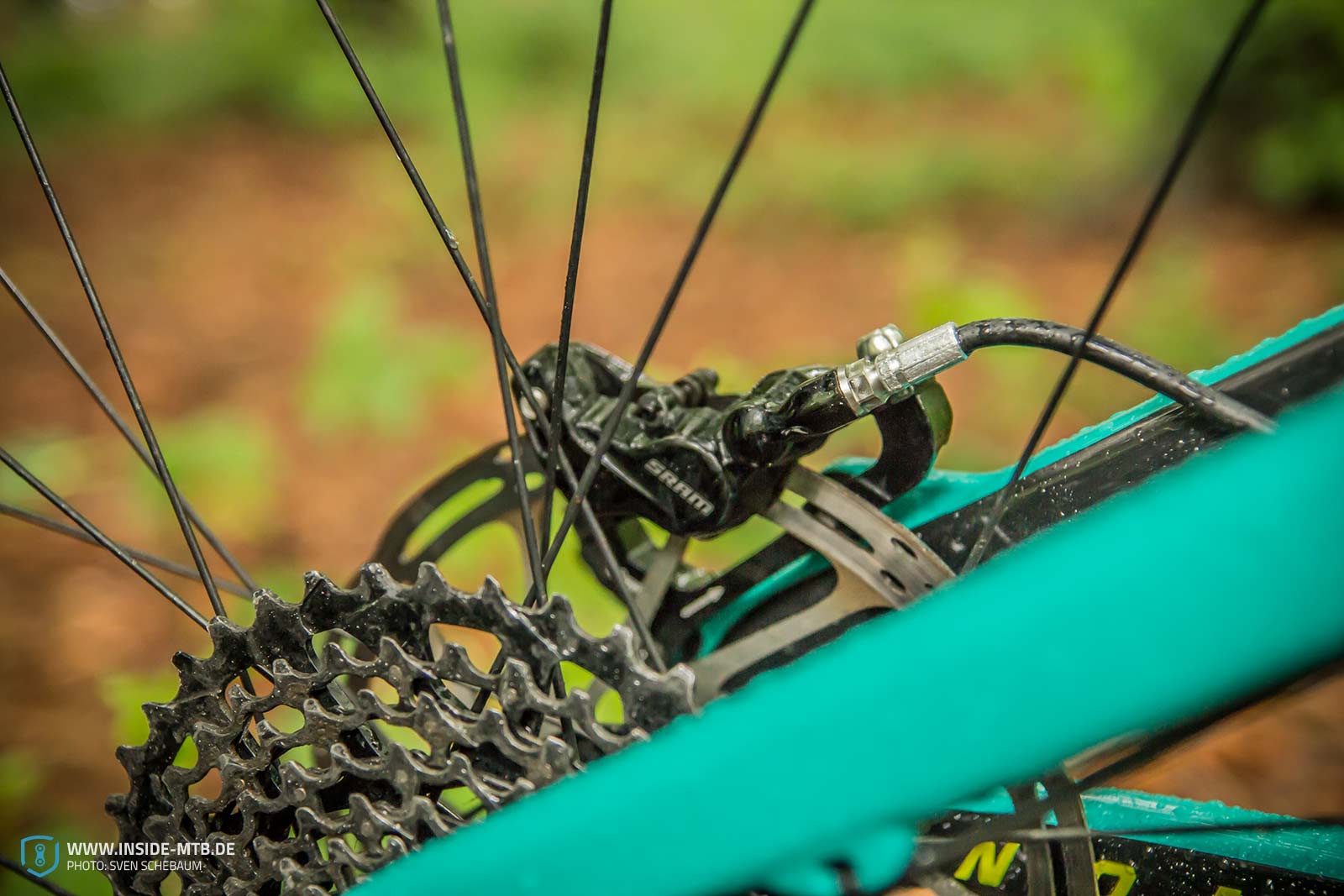 Sauber und einfach werden die Leitungen für Schaltwerk und Bremse an den Seiten des Sitzrohres vorbeigeführt. In Sachen Verarbeitung macht niemand Santa Cruz so schnell etwas vor. Die „Schwarzen“ Decals sind Carbon im Raw look, kombiniert mit dem Emerald ein wahrer Hingucker. Mit noch keinem Bike wurde man so oft im Park oder in unserem Falle, auf dem Bike Festival in Willingen, von anderen Fahrern angesprochen.