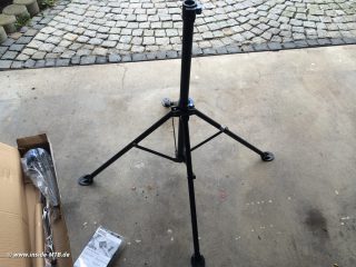 Nach dem Aufbau wurde natürlich ausgiebig geputzt und geschraubt. Neben einem kompletten Wechsel auf Tubeless, einer Neueinstellung des Lenkers inkl Aheadset und ausgiebiger Kettenpflege wurde der Powerfix Montageständer mit dem Urteil: Bestes Preisleistungsverhältnis wieder verstaut. Neben dem grundsoliden Aufbau des Ständers kann man die Standfestigkeit zusätzlich durch eine Festmontage am Boden verstärken. Klug mitgedacht für alle die das Gerät über das Rennwochende mitnehmen wollen. So kann man einfach die 4 Füße mit Heringen im Wiesenboden versenken und hat eine komplette Workstation parat.