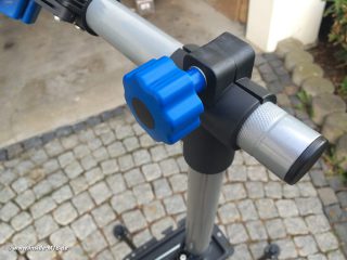 Nach dem Aufbau war dies der vermeidliche Schwachpunkt. Es zeigte sich jedoch, dass dies nicht so sein sollte. Die Kunststoffklemme hält das Bike sicher in der Position. Auch bei ruppigeren Arbeiten war dies kein Problem.